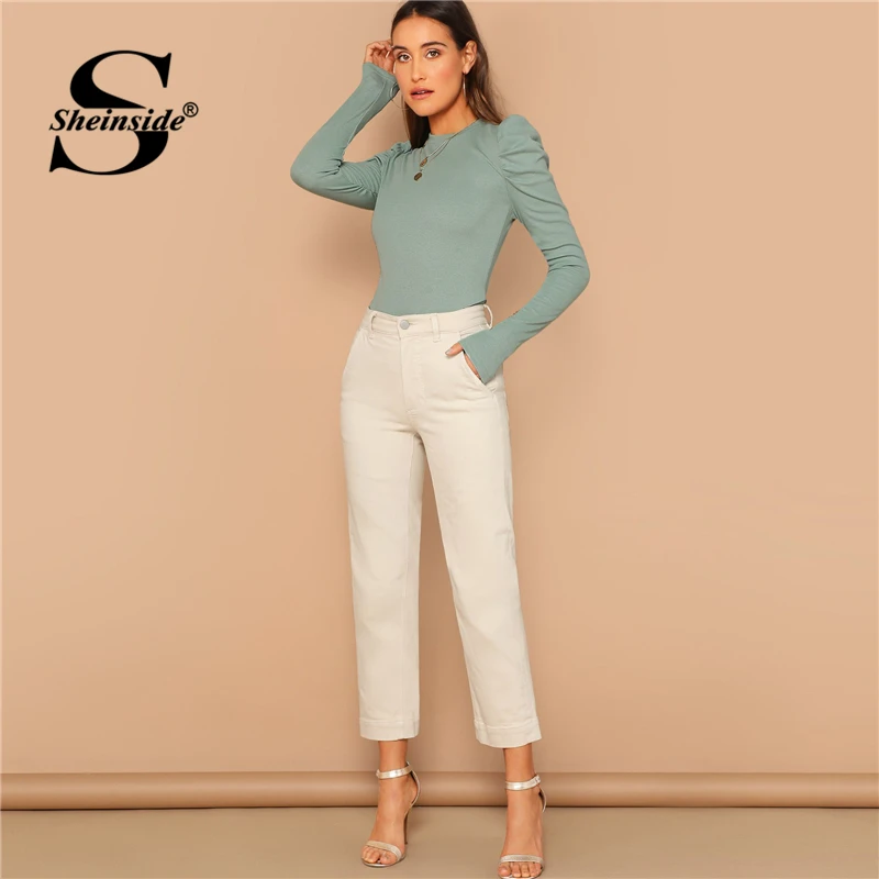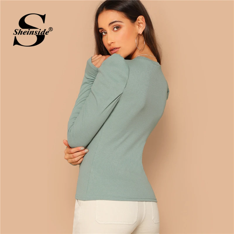 Special Offer Женская трикотажная футболка Sheinside, зеленая облегающая футболка с пышными рукавами, топы с длинными рукавами, осень 2019 Discount 46% Today!