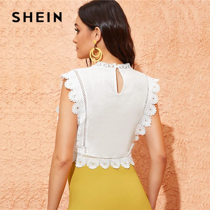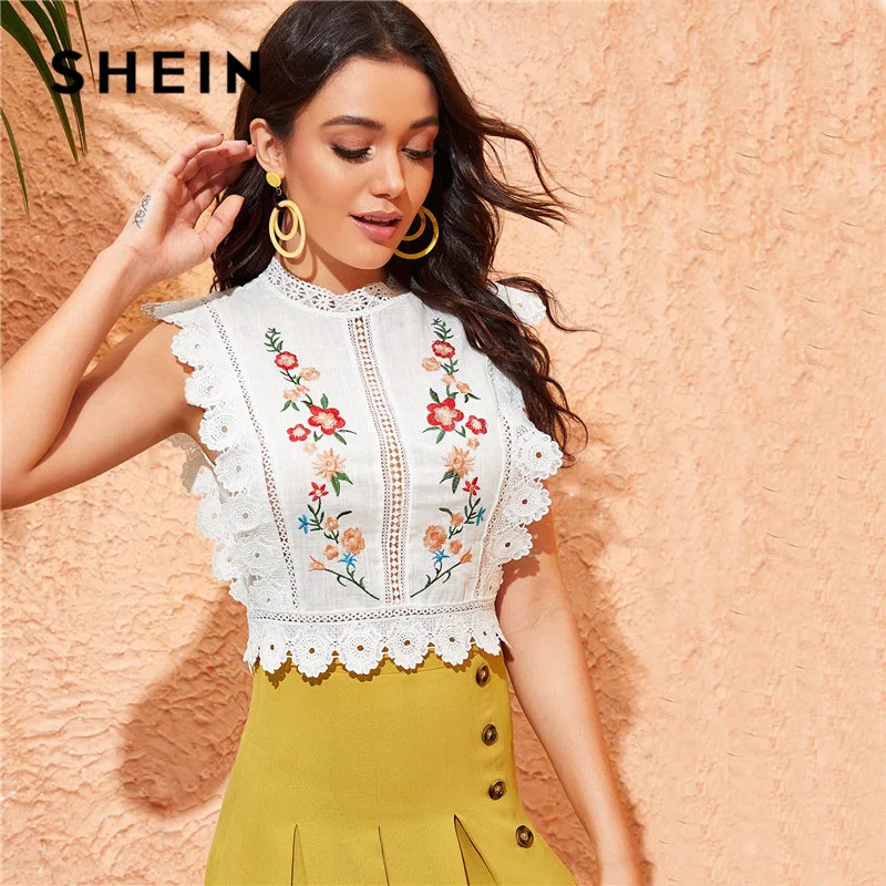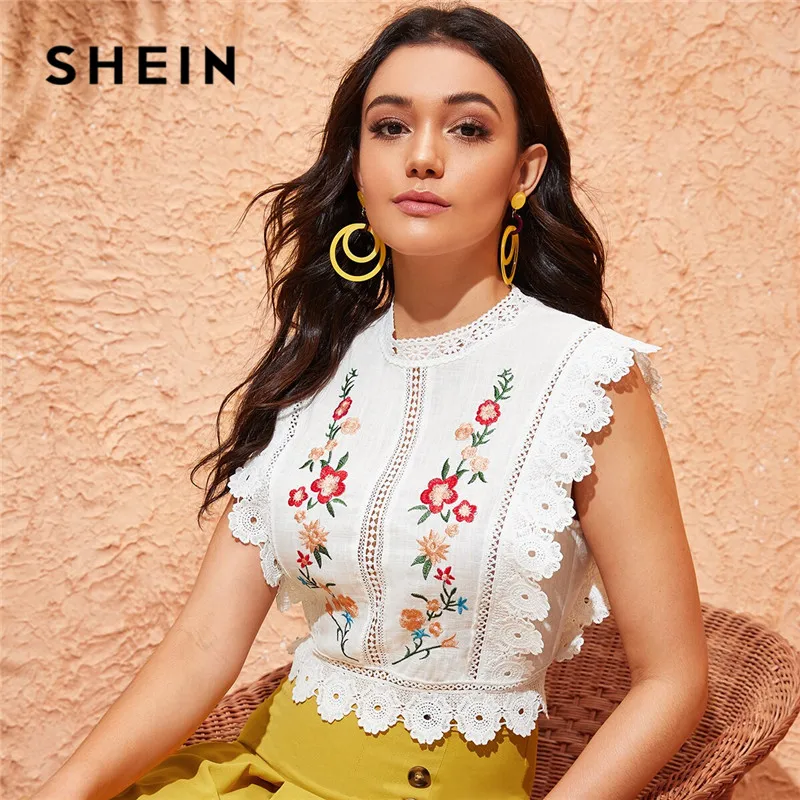 Special Offer SHEIN гипюровая кружевная блузка с вышивкой, белая блузка, Женские топы и блузки в стиле бохо, без рукавов, приталенный летний укороченный топ Discount 48% Today!