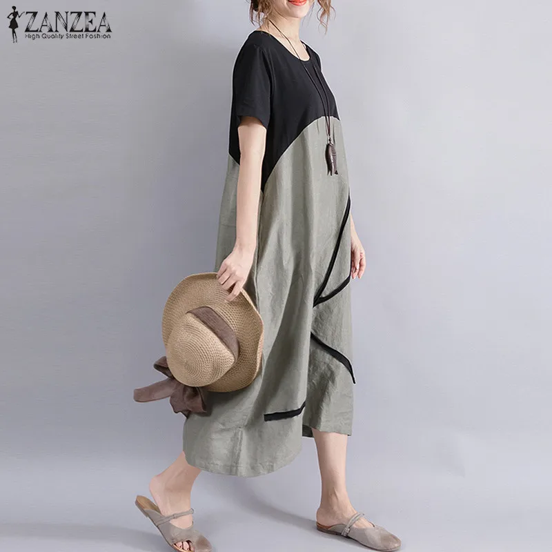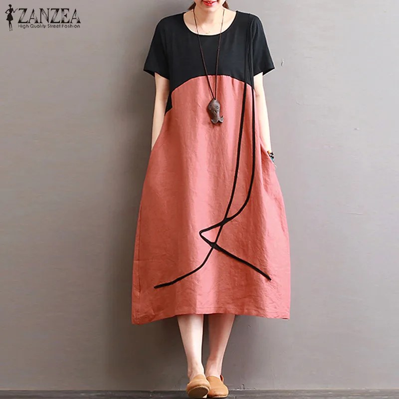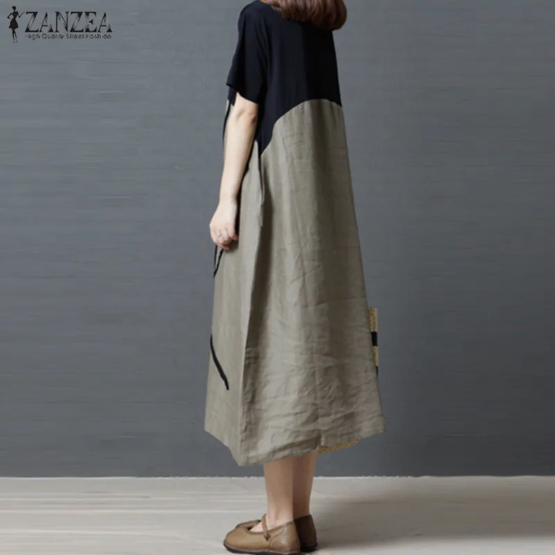 Special Offer Женское свободное льняное пляжное платье с О образным вырезом, с короткими рукавами и карманами, для вечеринок, большие размеры, ZANZEA Discount 45% Today!