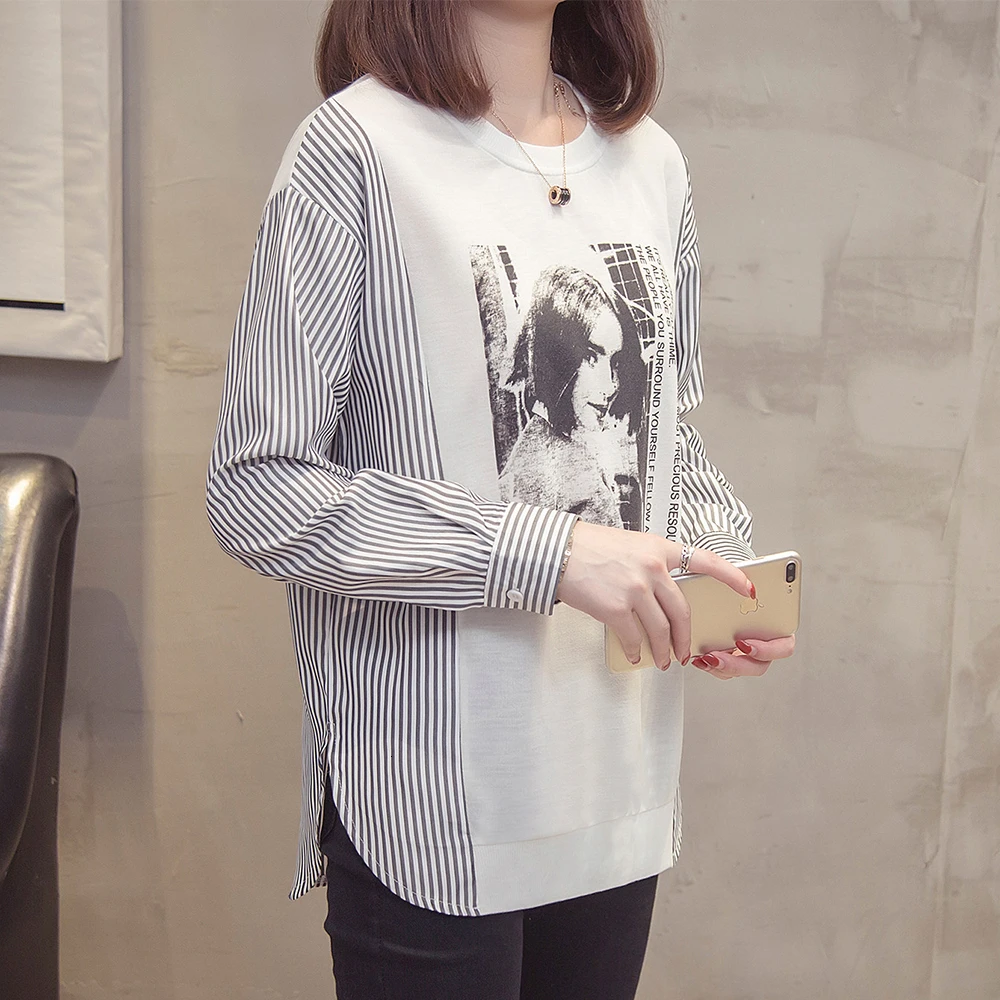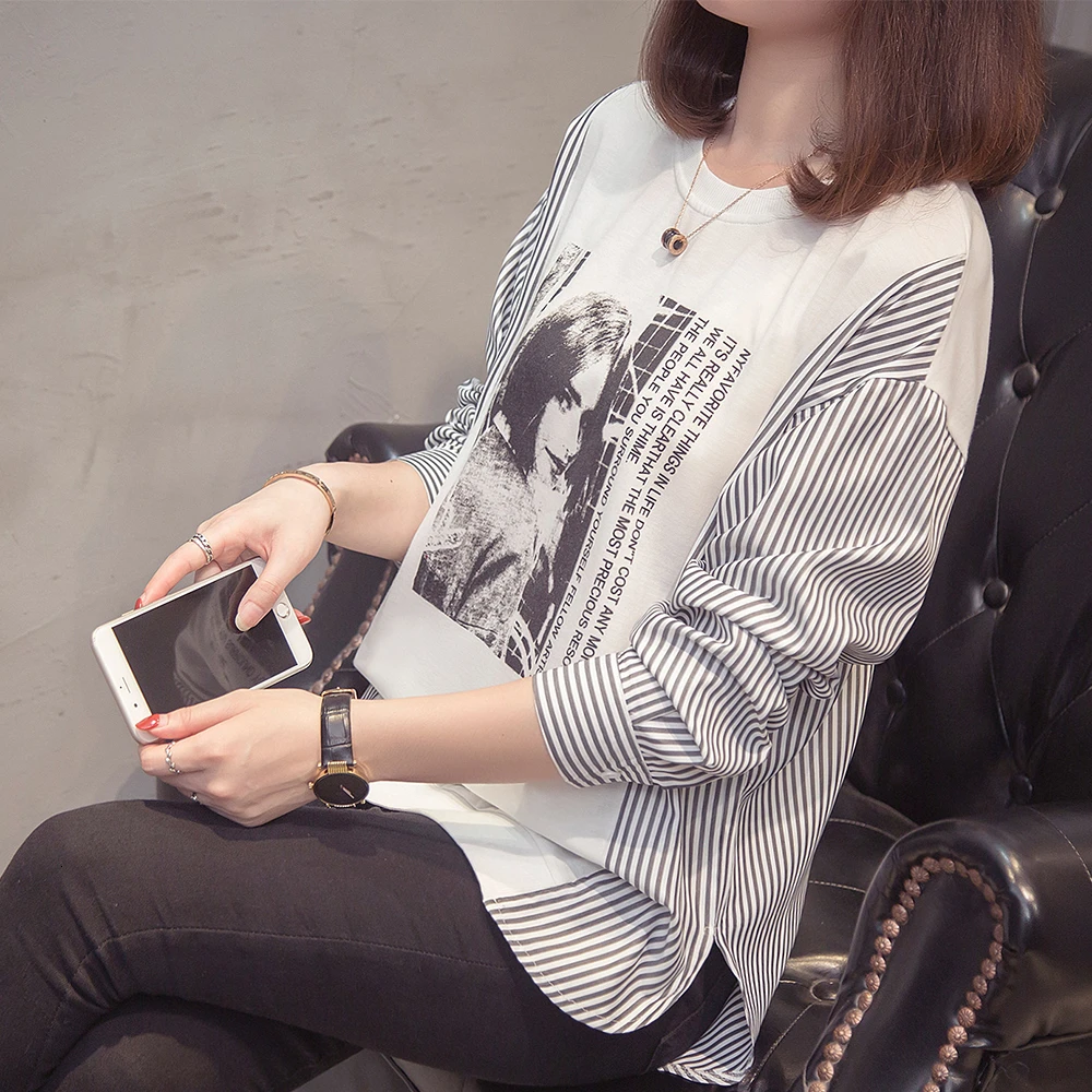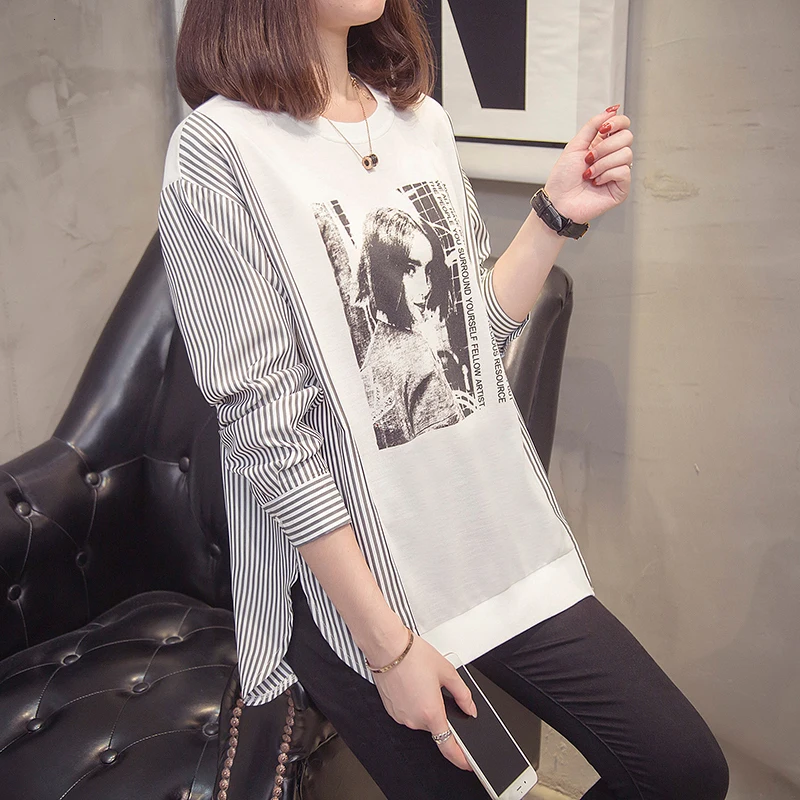 (40% Off) Купить Полосатая Лоскутная футболка размера плюс, Женская Осенняя Повседневная Свободная с графическим рисунком, Корейская туника дли... Цена Дешево