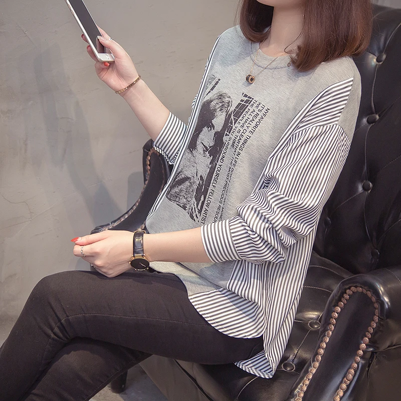 Special Offer Полосатая Лоскутная футболка размера плюс, Женская Осенняя Повседневная Свободная футболка с графическим рисунком, Корейская туника с дли... Discount 40% Today!